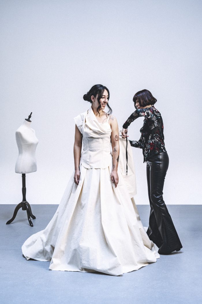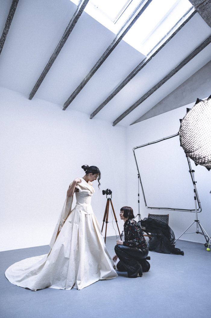 Crear composiciones artísticas donde la forma, el tejido y los bordados dialoguen contando la historia de la Novia, lo que da carácter al vestido y lo convierte en obra de arte que resalta la belleza y la singularidad de la novia en su día especial.